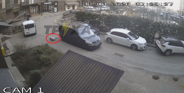 На кадрах видно, як троє чоловіків у військовій формі женуться за цивільним. Раптом під’їжджає бус, з якого вибігає ще один військовий. Вони затягують чоловіка до авто, а жінку відштовхують. На відео з іншого ракурсу видно, що жінка вчепилася в автівку, намагаючись зупинити її, але впала на ходу і дуже сильно вдарилася головою об асфальт.